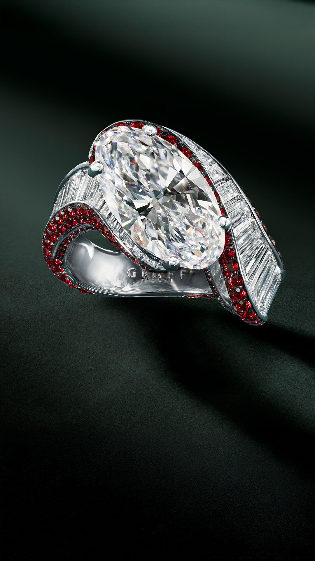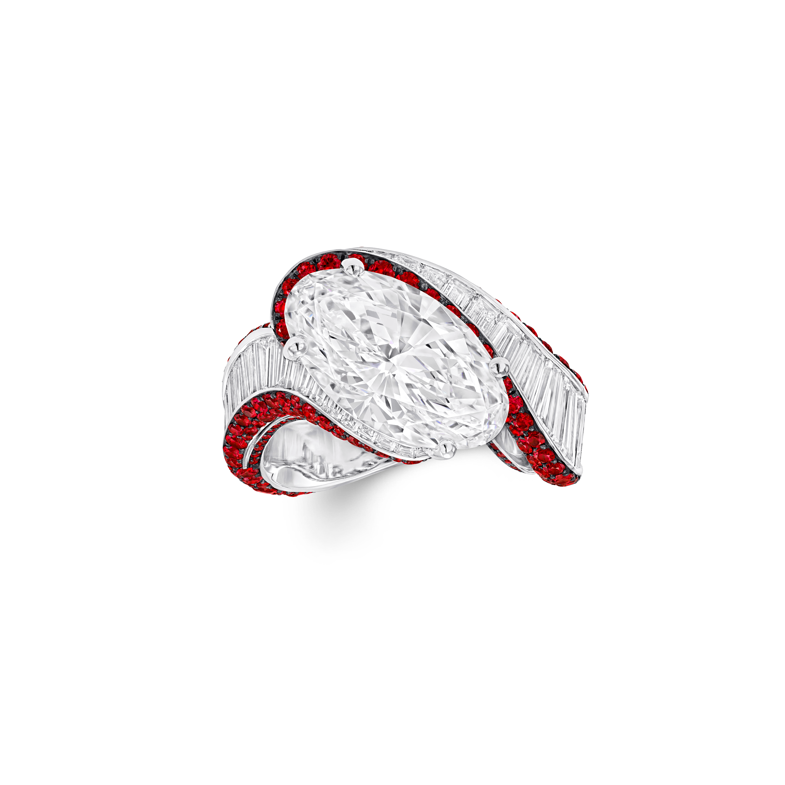 Surrounding the central stone, 47 custom-cut baguette cut diamonds are encircled by 354 round rubies. This creates a glowing contrast of colour as they swirl and twirl around the finger, emphasising the soft, curved silhouette of the central stone, set in white gold.
