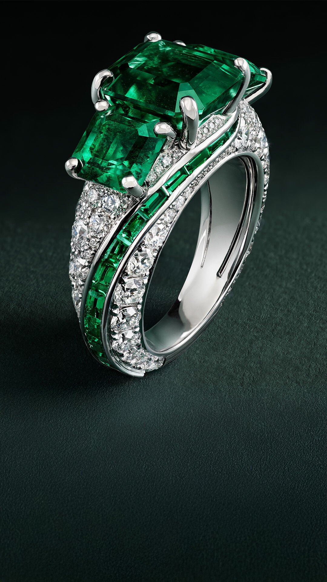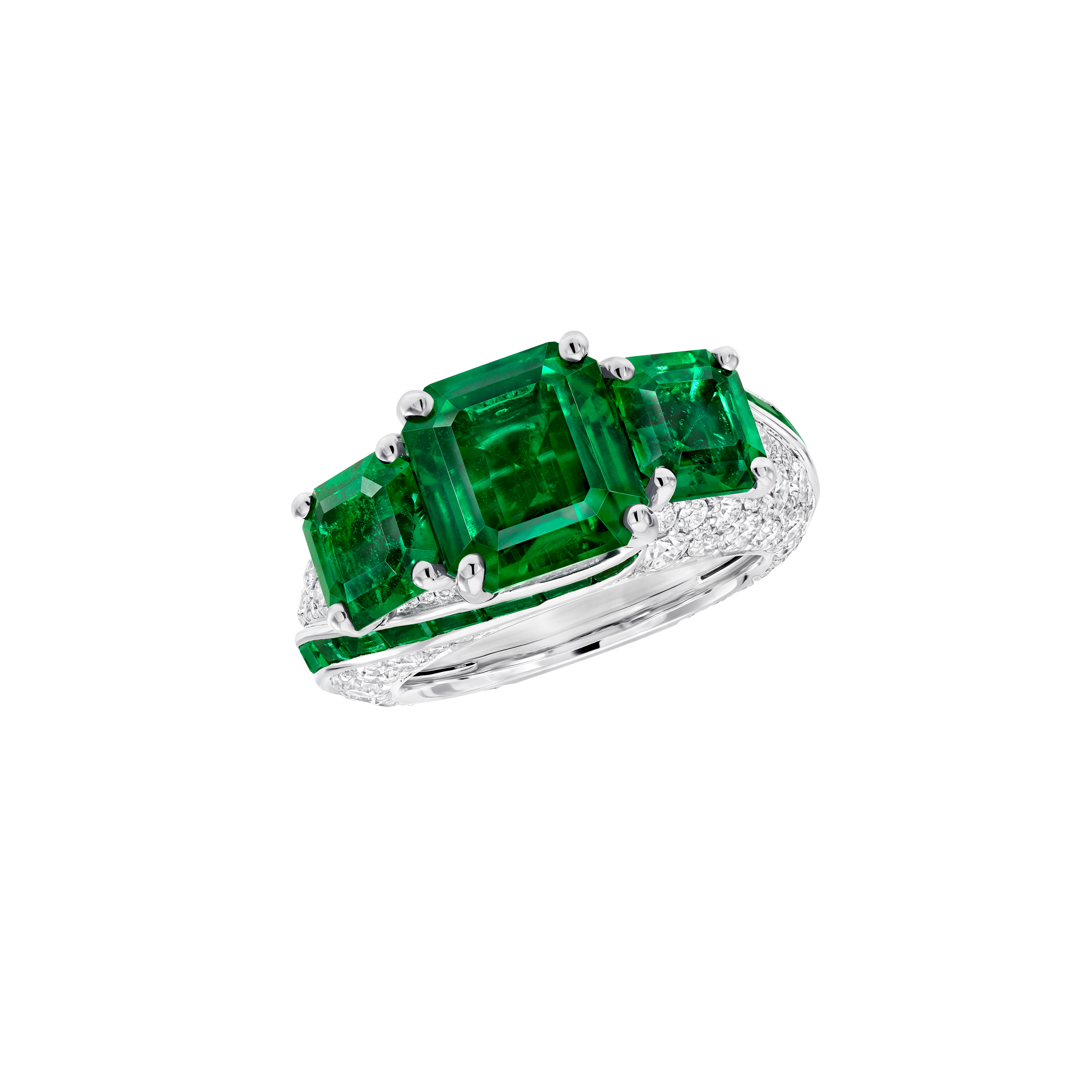 A verdant triptych of 4.66 carat, 1.57 carat and 1.45 carat emerald cut emeralds are set within an intricate ring design, featuring a further 28 custom-cut baguette cut emeralds and 115 luminous round diamonds, which extend around a white gold band.