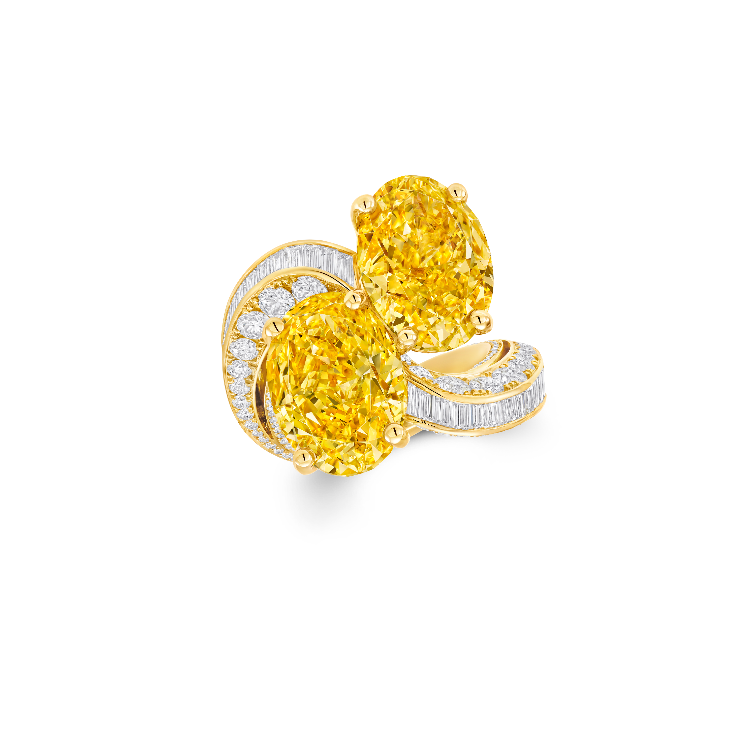 Handcrafted in yellow gold by skilled master artisans and set with two 8 carat oval Fancy Vivid Yellow diamonds, a spiralling line of intertwined custom-cut baguette cut white diamonds and pavé yellow diamonds encircle the finger.