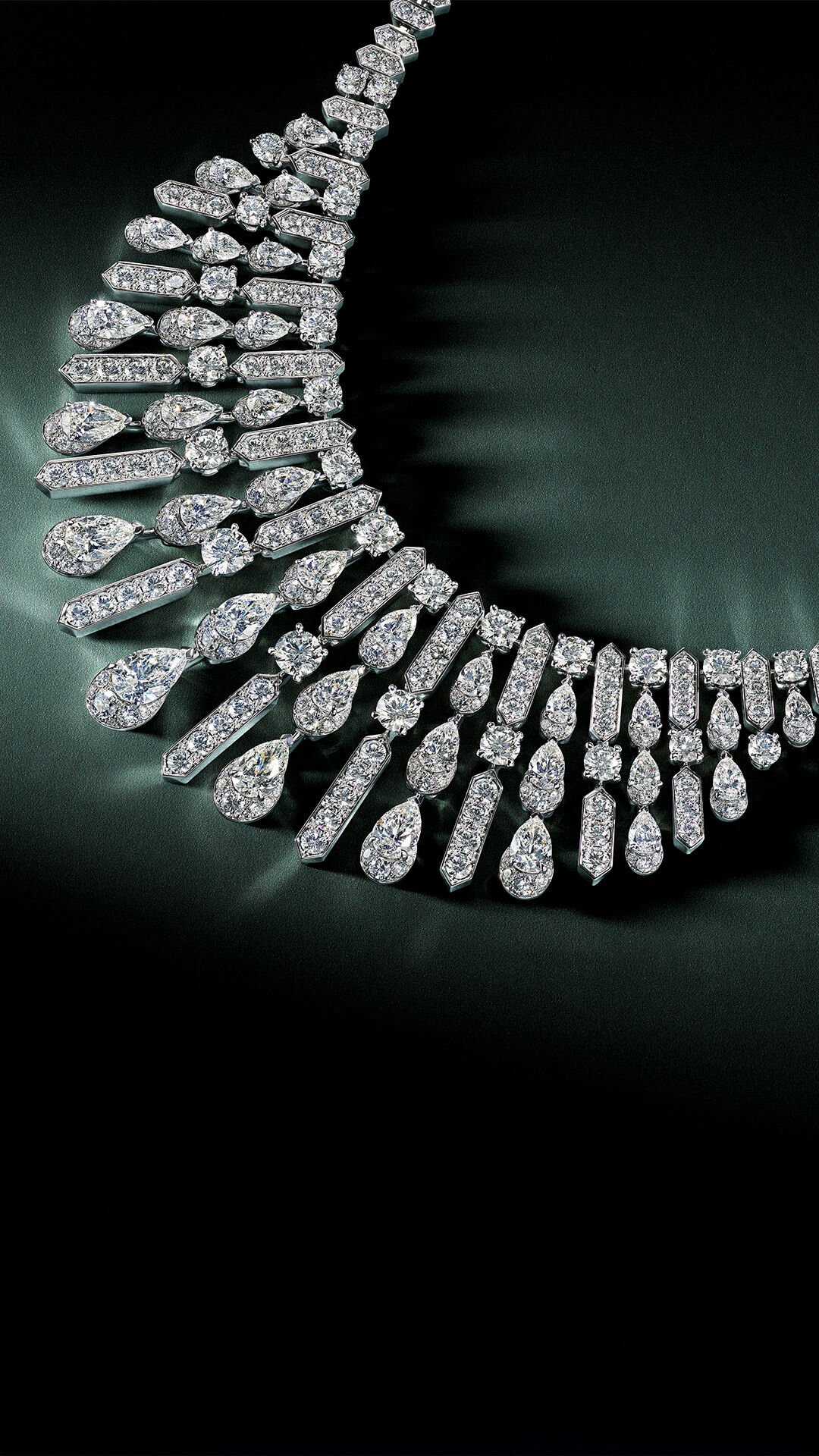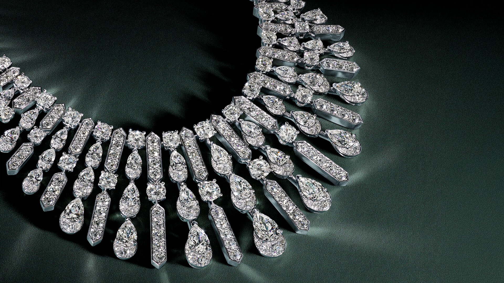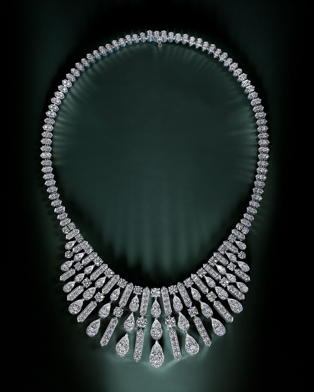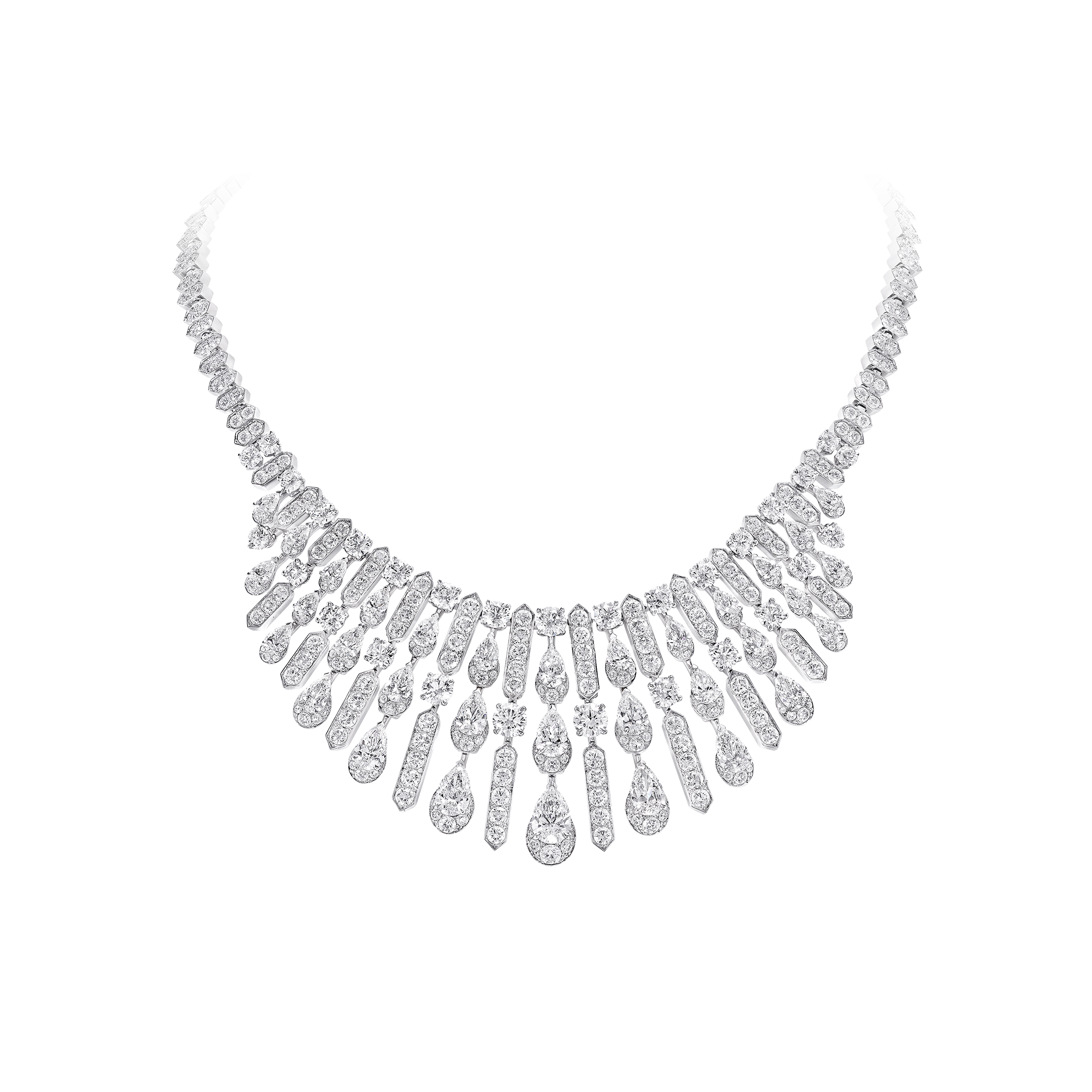 Composé de 487 diamants taille poire et ronds, avec un poids total de 43,78 carats, cette pièce explore une interaction élégante entre la lumière et la forme. Confectionnés en or blanc, les diamants taille poire tombent en cascade de pierres brillantes rondes, alternant avec des lignes angulaires et audacieuses de diamants ronds et pavés ronds brillants.