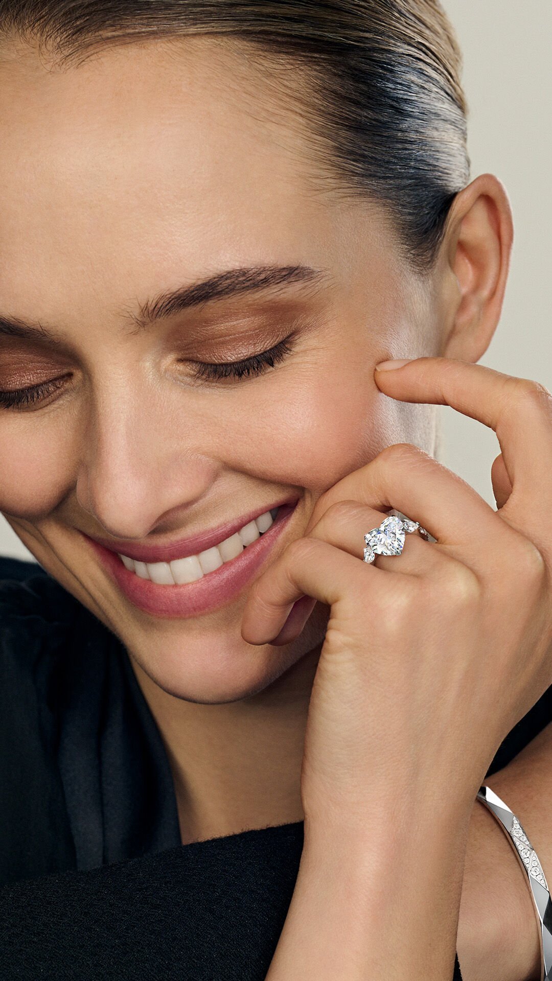Quintessence du romantisme, la taille cœur exige un savoir‑faire d’exception pour façonner ses courbes délicatement arrondies. La pierre révèle 59 facettes taillées et polies une à une, dans des proportions d’une précision absolue, de l’échancrure à la pointe.