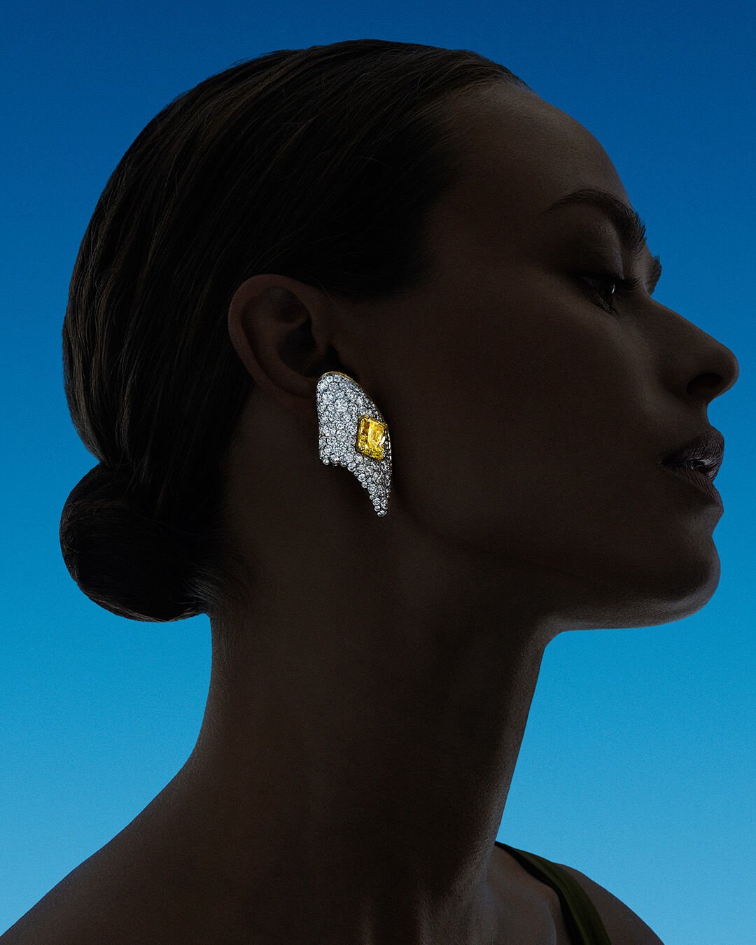 Image shows model wearing Graff Yellow and White Diamond High Jewellery earrings