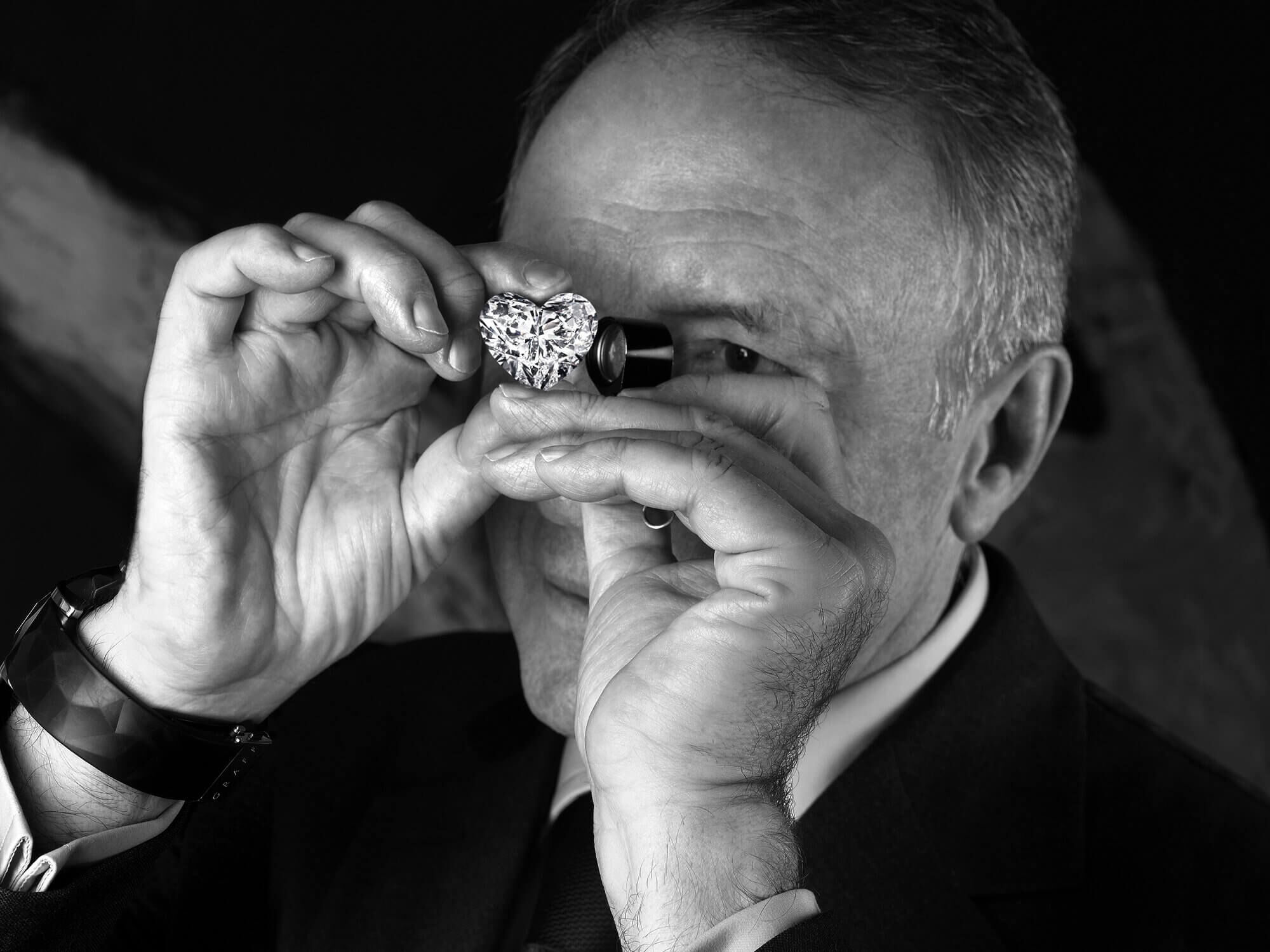 Laurence Graff OBE inspecting heart shape diamond through loupe