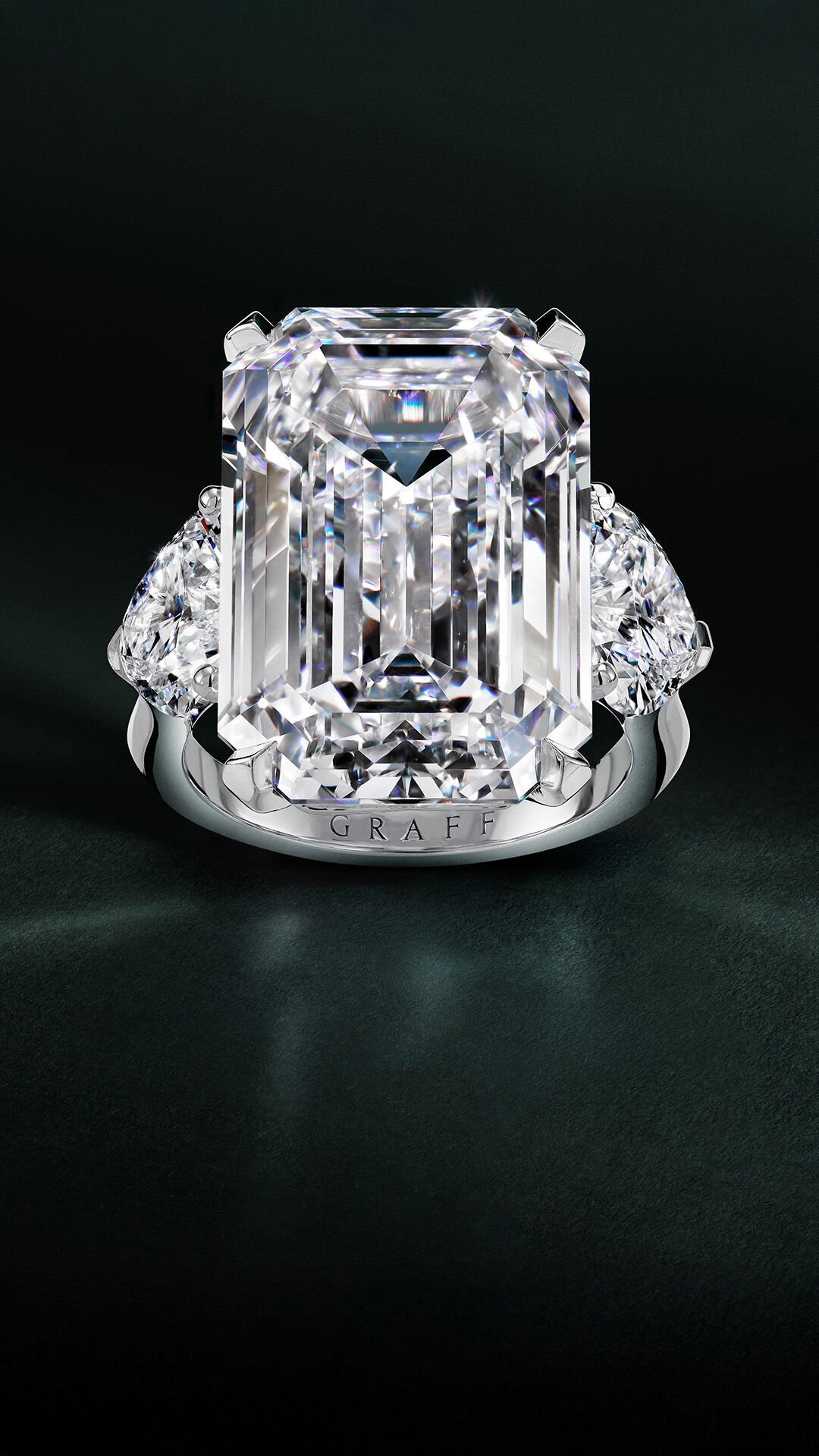في دار "غراف"، يتم عرض التميز في مجال الحرفية من خلال كل ابتكار. تحيط ألماستان جانبيتان على شكل قلب بحجر ألماس مدهش بقَطع الزمرد خالي من العيوب بلون D وبوزن 20,45 قيراط مع شكل مصقول ممتاز وتماثل ممتاز، ليصل إجمالي الوزن إلى 3,04.