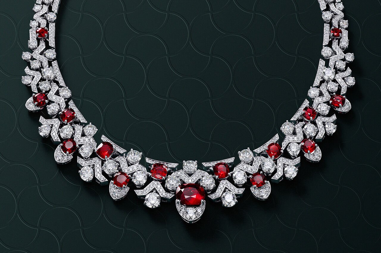 Combining a superior collection of gems with contemporary design, this high jewellery necklace and pair of earrings showcase vivid rubies set alongside sculptural arrangements of custom-cut diamonds – the boldest reserved for the central motif, which glimmers with a vibrant power.