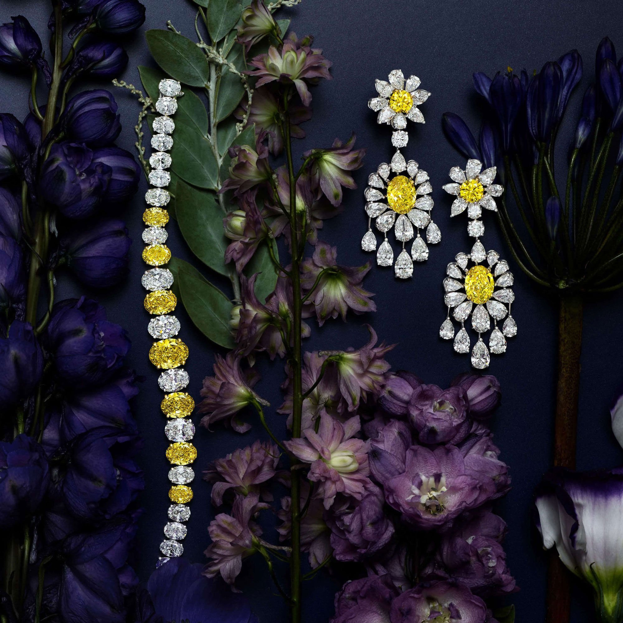 Fancy Vivid Yellow and white diamond Abstract earrings (20.21cts). 5.03 carat Fancy Vivid Yellow round diamond ring (12.30cts). Fancy Intense Yellow and white oval diamond bracelet (39.48cts). Fancy Vivid Yellow and white multishape diamond earrings (36.85cts).