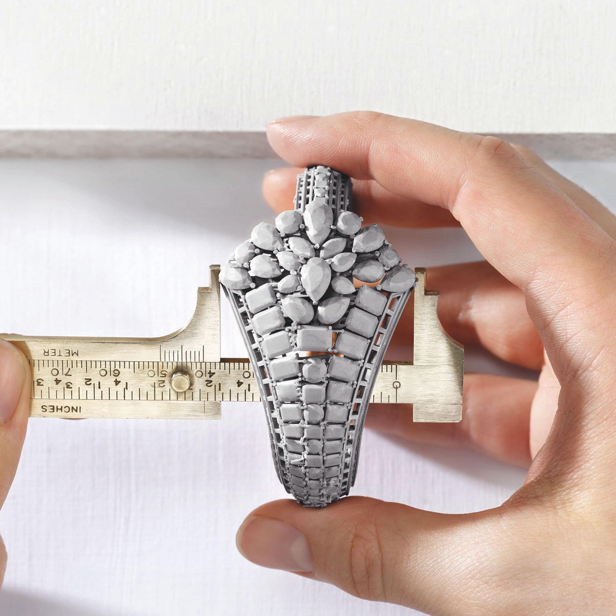 Once the 3D model had been finessed in CAD, the design was deconstructed into its individual components, and produced in resin using a state-of-the-art 3D printer. When the design and technology teams were content that the physical item looked exactly as it did on screen, the intricate skeletons that hold the diamonds in place were cast in 18K white gold.