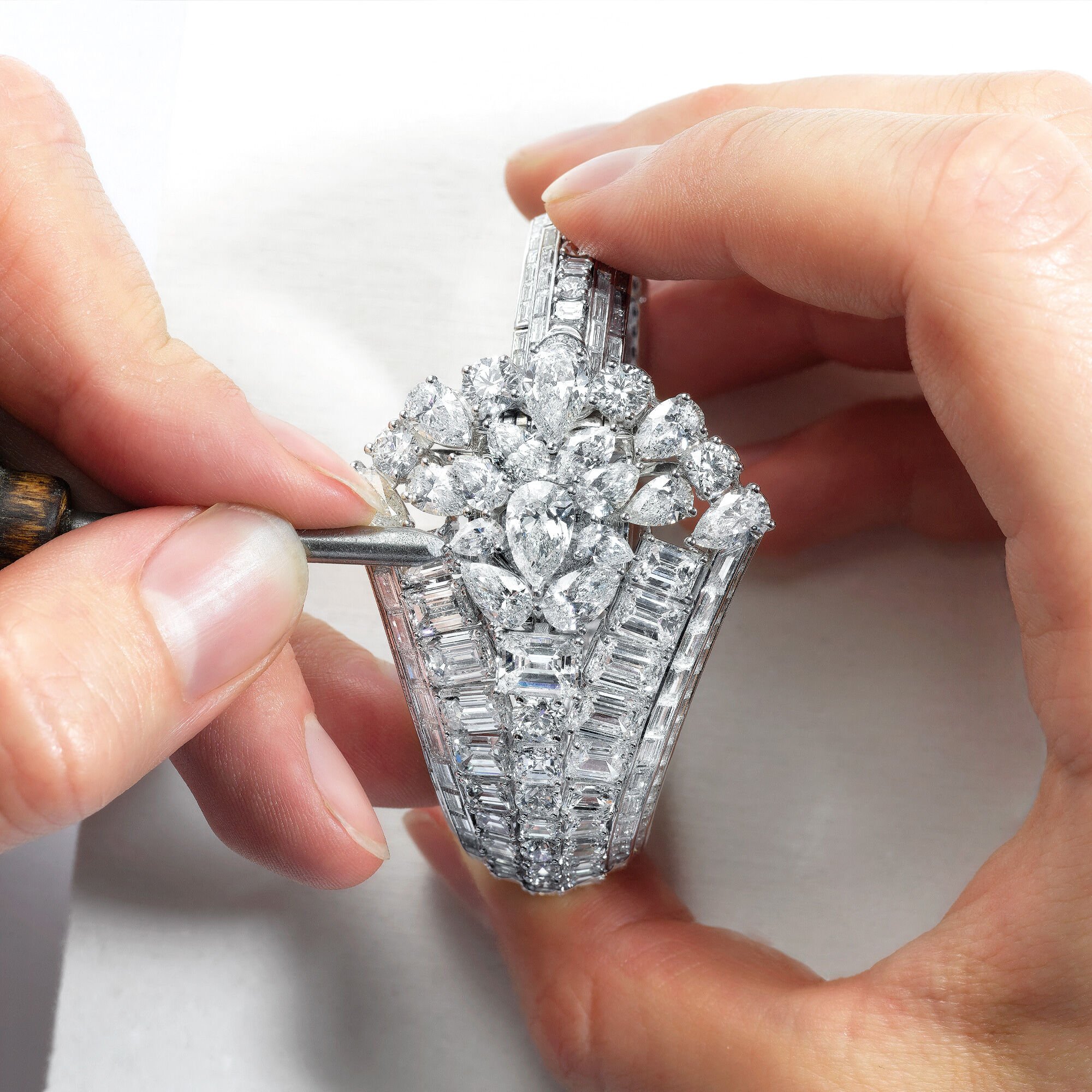 Each stone was examined through a loupe by an expert eye to ensure it matched the design perfectly. Special attention was paid to both the shape and depth of the diamonds to ensure they had room to move – a vital consideration with a design of this complexity. With absolutely no room for error, more than 44 carats of stones made the final cut, uniform in their brilliance.