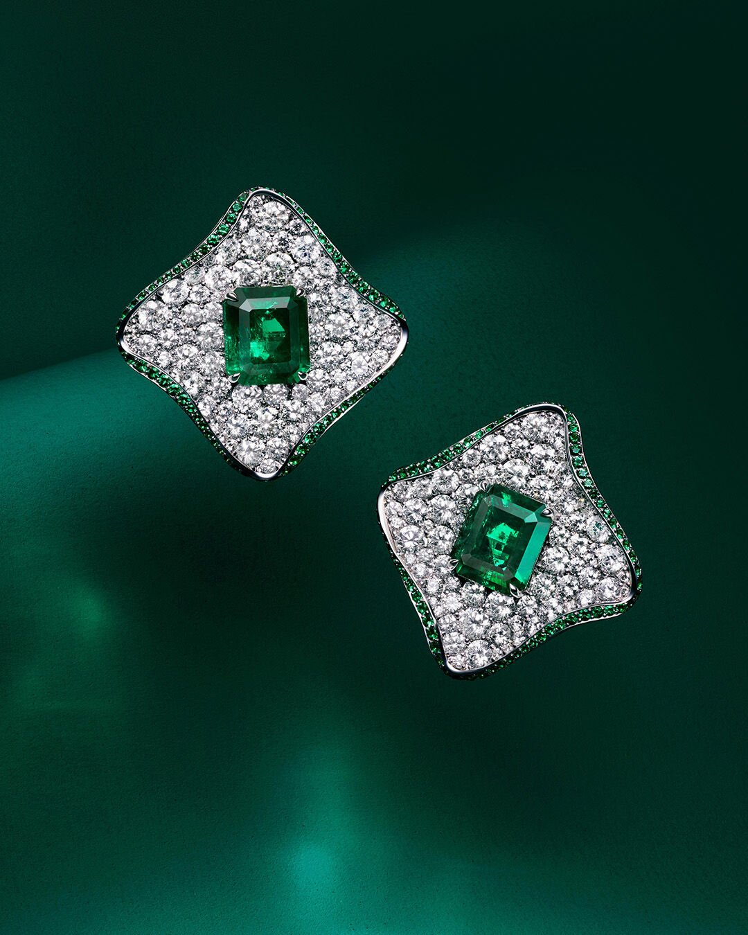 서로 조화를 이루는 하이 주얼리 이어링은 정교한 링 디자인 안에 배치된 초록빛 에메랄드 컷 에메랄드 3개, 그리고 화이트 골드 밴드를 따라 세팅된 커스텀 컷 바게트 컷 에메랄드 및 라운드 다이아몬드와 아름답게 어우러집니다.