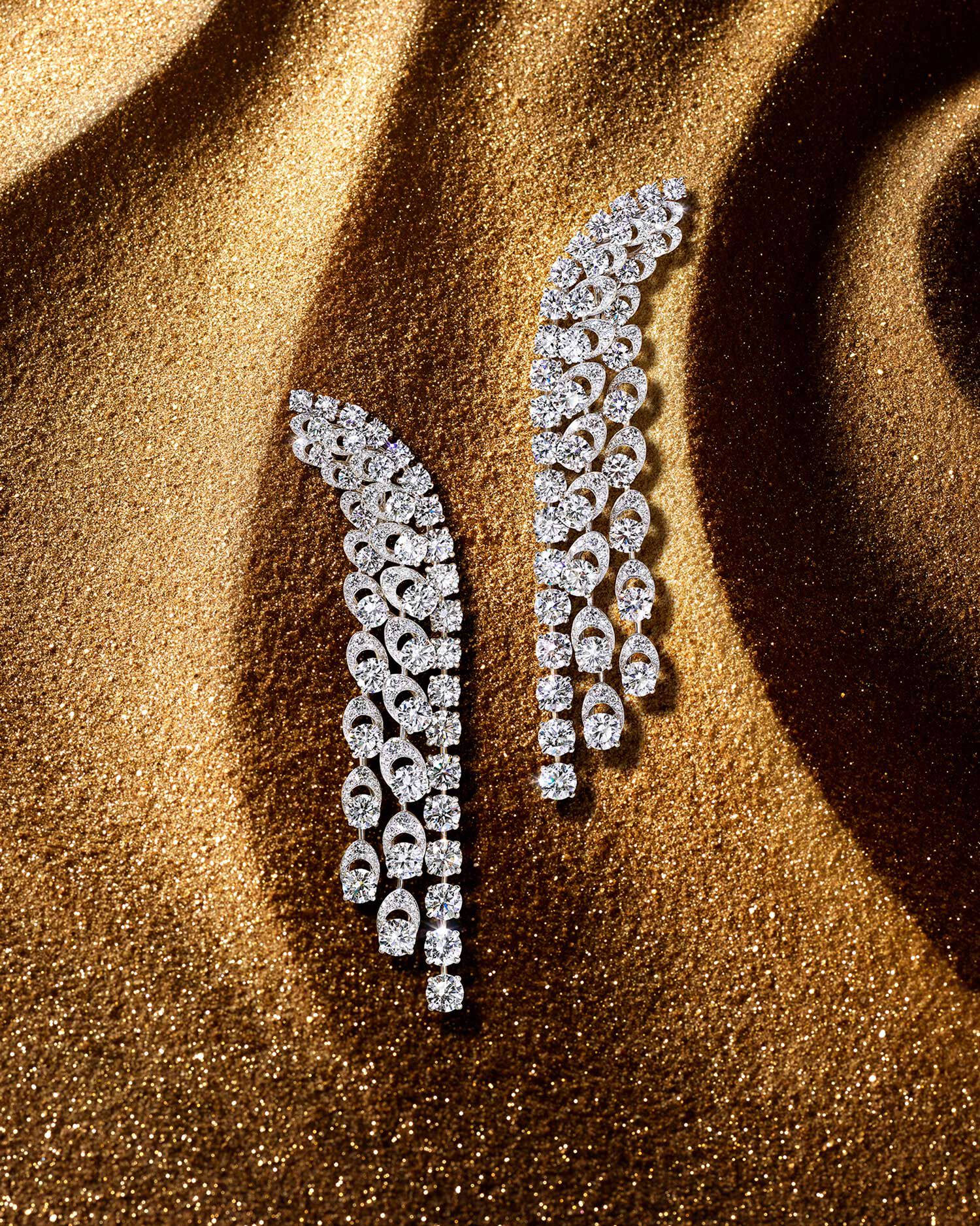 Graff Gateway图案化作醉人钻石项链和耳环的璀璨钻石流苏,随着女士的举手投足摇曳生姿,灵动璀璨。