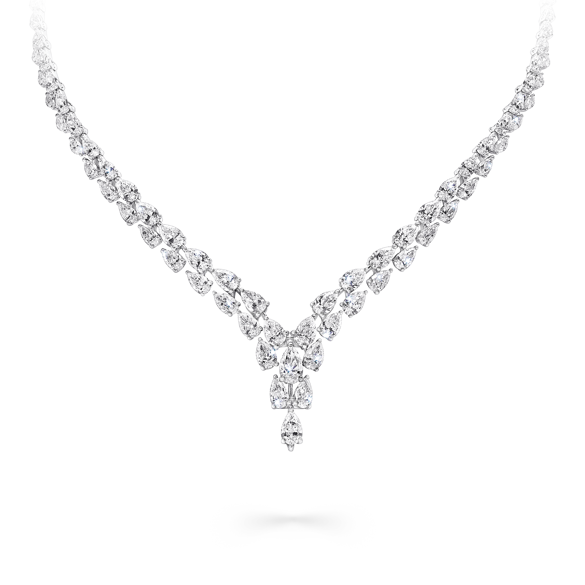 Crafted in a classic V-shape, double rows of pear shape diamonds cascade downwards towards the central motif – a cluster of further pear shape stones. The precise cut and placement of each diamond creates a dramatic sense of movement.